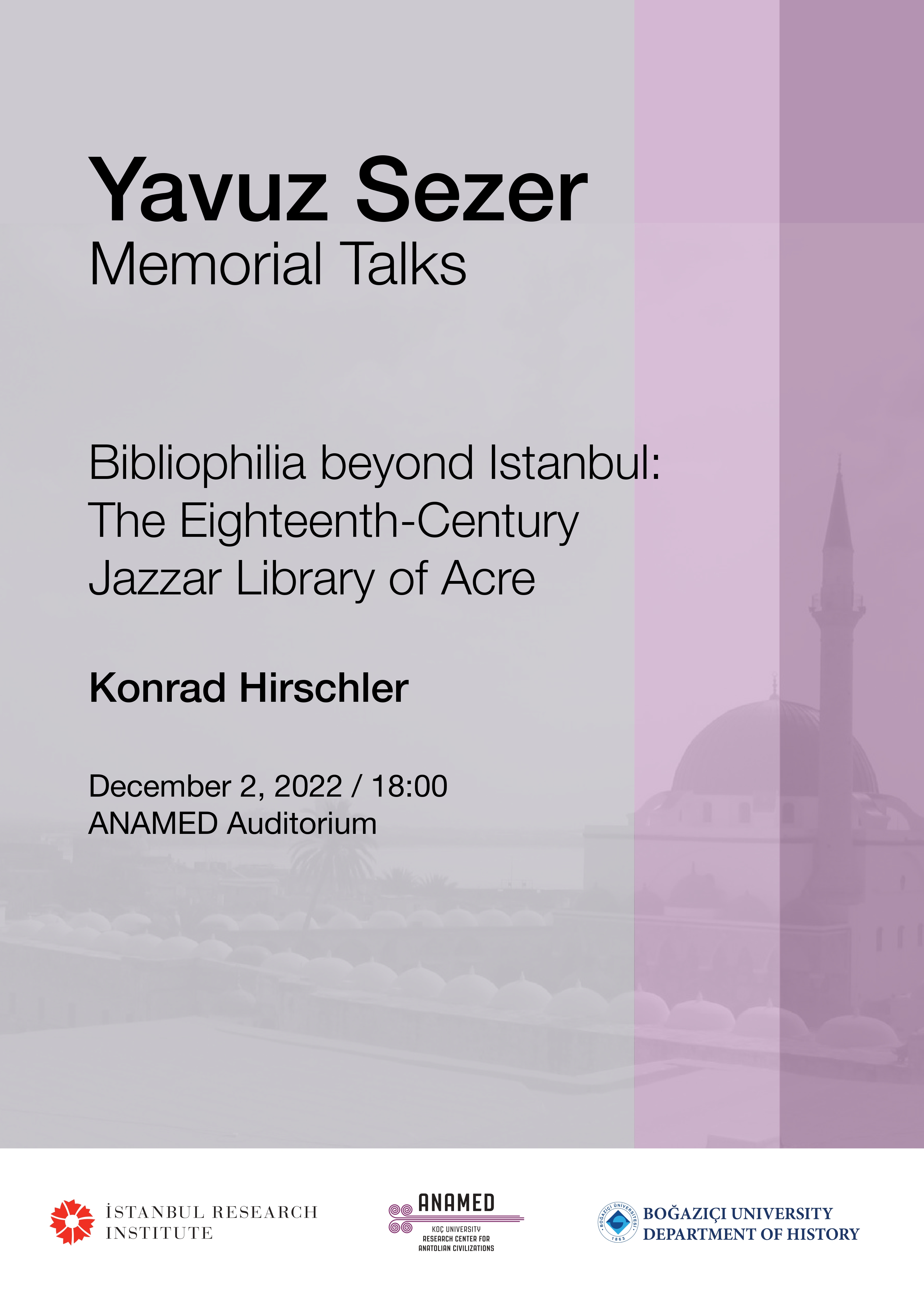 Department of History cordially invites you to Yavuz Sezer Memorial Talks. This year’s talk titled "Bibliophilia Beyond Istanbul: The Eighteenth-Century Jazzar Library of Acre" will be delivered by Konrad Hirschler, on December 2, 2022, at 18:00. The event will take place at ANAMED Auditorium.