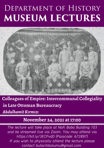 Department of History cordially invites you to the Museum Lecture by Abdulhamit Kırmızı titled "Colleagues of Empire: Intercommunal Collegiality in Late Ottoman Bureaucracy" on November 24, 2021 at 17.00.