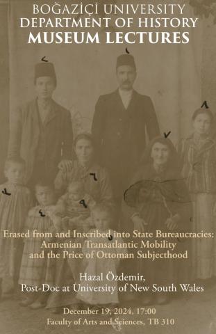 Department of History cordially invites you to the upcoming Museum Lecture by Hazal Özdemir, titled 'Erased from and Inscribed into State Bureaucracies: Armenian Transatlantic Mobility and the Price of Ottoman Subjecthood.' The lecture is scheduled to take place on December 19, 2024 at 5:00 PM in TB 310.