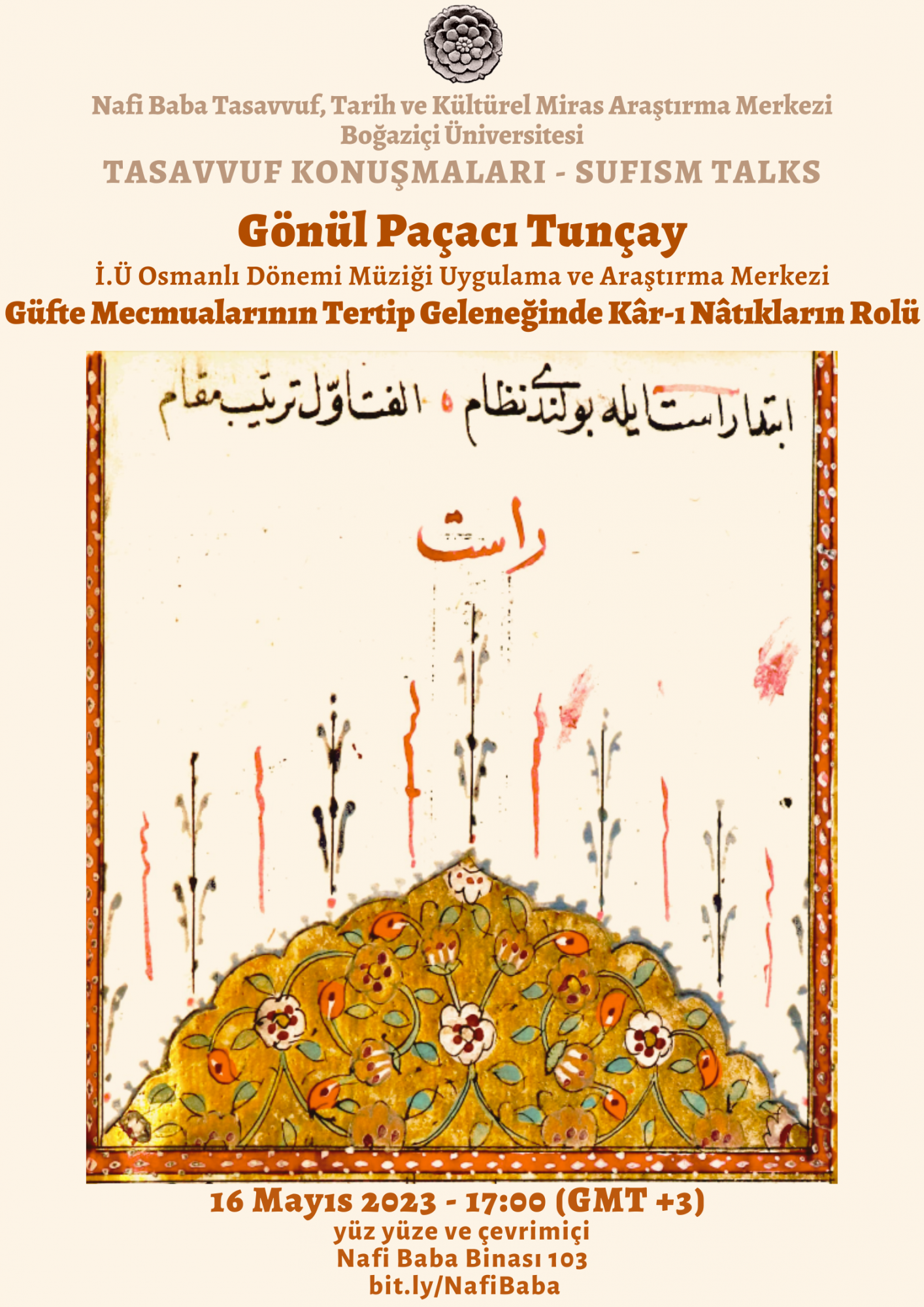 Boğaziçi University History Department invites you to the upcoming lecture by Gönül Paçacı Tunçay in the Nafi Baba Sufism Talks Series titled "Güfte Mecmualarının Tertip Geleneğinde Kâr-ı Nâtıklarin Rolü" The lecture will be held in Nafi Baba Building 103 on 16 May 2023, at 17:00 (GMT+3). This talk will be in Turkish.