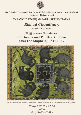 You are cordially invited to the upcoming lecture in the Sufism Talks Series titled "Hajj across Empires: Pilgrimage and Political Culture after the Mughals, 1739-1857" by Rishad Choudhury. The lecture will be held on April 15, 2025, at 5:00 PM. The lecture will be held online via BuLive: bit.ly/SufismTalks