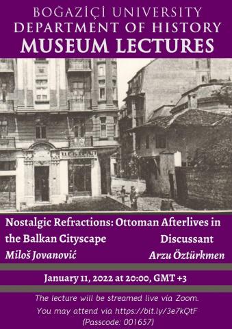 Department of History cordially invites you to the upcoming Museum Lecture titled “Nostalgic Refractions: Ottoman Afterlives in the Balkan Cityscape” by Miloš Jovanović, with the participation of Arzu Öztürkmen as discussant. The lecture will be held online via Zoom on January 11, 2022, at 20:00. You may attend the lecture by the following link: