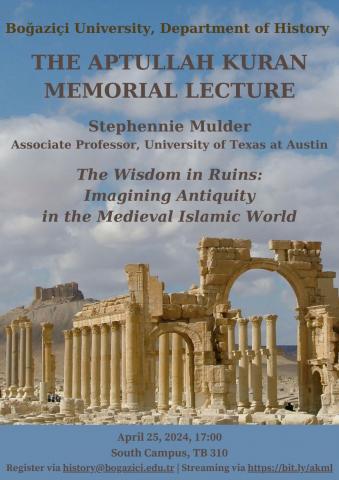 You are cordially invited to attend the upcoming Aptullah Kuran Memorial Lecture titled "The Wisdom in Ruins: Imagining Antiquity in the Medieval Islamic World," presented by Stephennie Mulder. The lecture is scheduled for April 25, 2024, at 17:00, in TB 310.