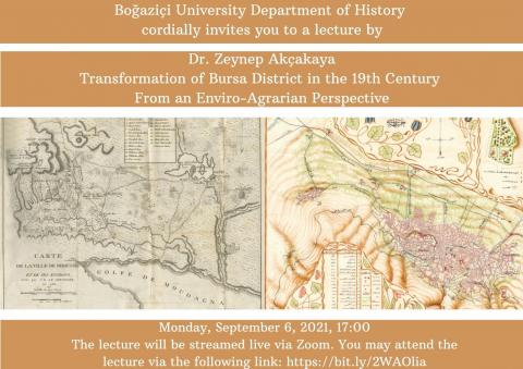 Department of History cordially invites you to an online lecture by Dr. Zeynep Akçakaya, titled “Transformation of Bursa District in the 19th Century From an Enviro-Agrarian Perspective” on September 6, 2021, at 17.00. The lecture will be streamed live. You may attend the lecture via the following link: https://bit.ly/2WAOlia