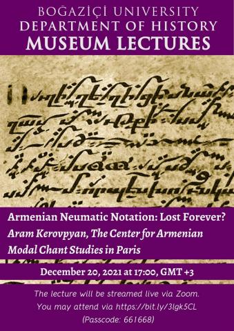 Department of History cordially invites you to the Museum Lecture titled "Armenian Neumatic Notation: Lost Forever?" by Dr. Aram Kerovpyan on December 20, 2021, at 17.00. You may attend the lecture via the following link: https://bit.ly/3lgk5CL (Passcode: 661668)