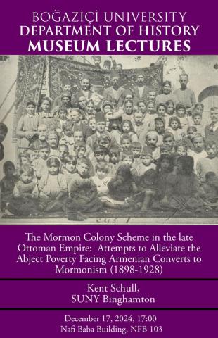 Department of History cordially invites you to the upcoming Museum Lecture by Kent Schull, titled "The Mormon Colony Scheme in the late Ottoman Empire: Attempts to Alleviate the Abject Poverty Facing Armenian Converts to Mormonism (1898-1928)." The lecture is scheduled to take place on December 17, 2024 at 5:00 PM in Nafi Baba Building 103.