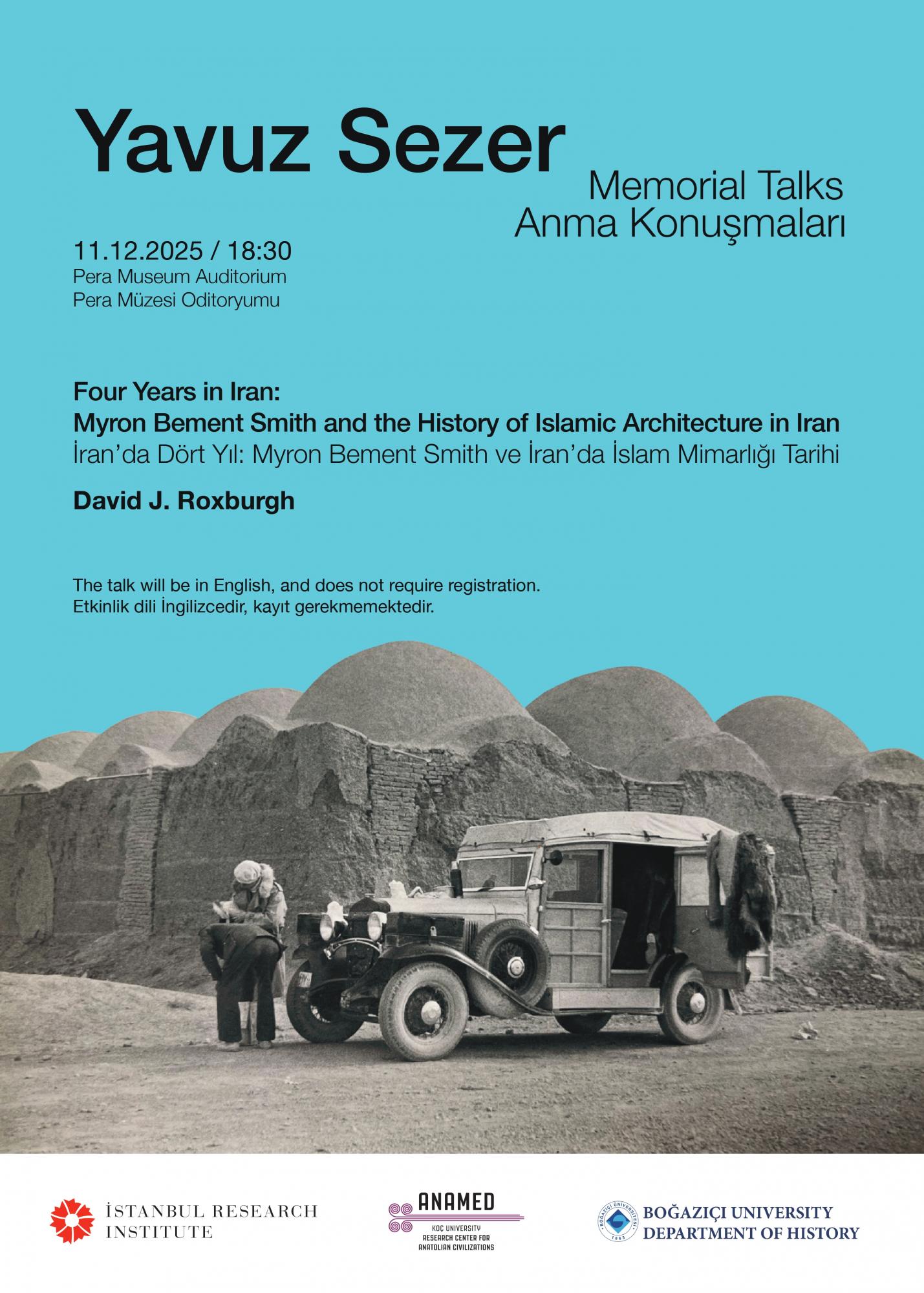 Department of History cordially invites you to this year's Yavuz Sezer Memorial Talk, titled 'Four Years in Iran: Myron Bement Smith and the History of Islamic Architecture in Iran,' to be delivered by David J. Roxburgh on December 11, 2025, at 6:30 p.m. The talk will be at Pera Museum Auditorium is free of charge and does not require registration. The event will be in English.